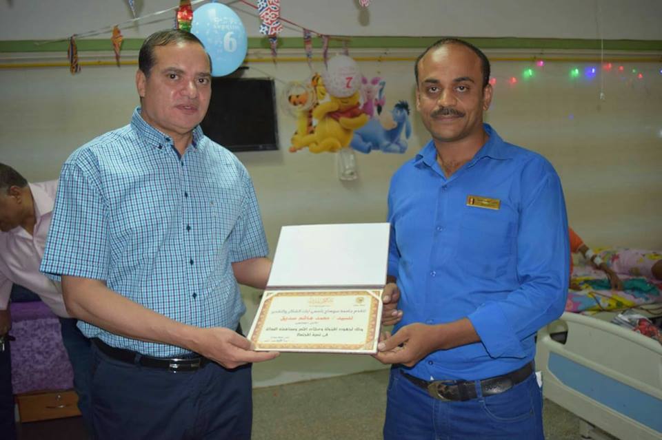 كرم اليوم الدكتور احمد عزيز عبد المنعم رئيس جامعة سوهاج محمد هاشم صديق معاون أمن بقسم طب الاطفال بالمستشفي الجامعي وذلك لتبرعه لمساعدة مرضي الاطفال بوحدة الحالات الحرجة بقسم الاطفال.