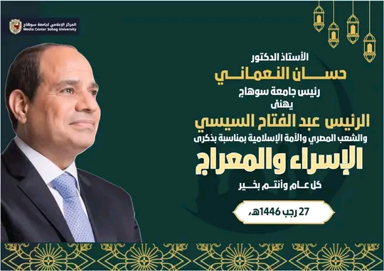 وجاء نص البرقية كلاتي”يطيب لي أن أتقدم بإسمي وبإسم منسوبي جامعة سوهاج بخالص التهانى القلبية لفخامتكم في ذكرى الإسراء والمعراج، هذه الذكرى العطرة التي جسدت منارة في تاريخ الرسالة الإسلامية العظيمة، تلك الرحلة المباركة التي جاءت لنستلهم منها معانى وقيم الإثابة وحسن الجزاء”.
