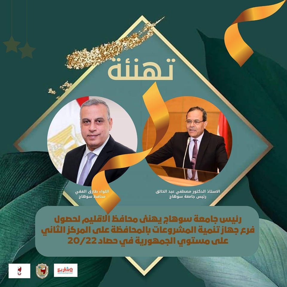 رئيس جامعة سوهاج يهنئ محافظ الإقليم لحصول فرع جهاز تنمية المشروعات بالمحافظة على المركز الثاني على مستوى الجمهورية فى حصاد ٢٠٢٢