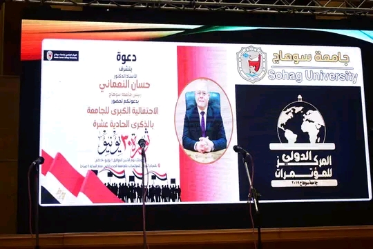 شهد الدكتور حسان النعماني رئيس جامعة سوهاج احتفالية الجامعة بمناسبة ذكرى ثورة 30 يونيو الحادية عشر، بحضور الدكتور عبدالناصر يس والدكتور خالد عمران نواب رئيس الجامعة، المحاسب أشرف القاضي أمين عام الجامعة، الدكتور علاء غالي رئيس طلاب من اجل مصر واحمد صابر رئيس هيئة ثقافة سوهاج، و عمداء الكليات ووكلائها، أعضاء هيئة التدريس، والجهاز الاداري والطلاب وذلك بمقريها الجديد والقديم والعاملين والطلاب، وذلك بقاعة قناة السويس بالمركز الدولي للمؤتمرات بالحرم الجامعي الجديد.