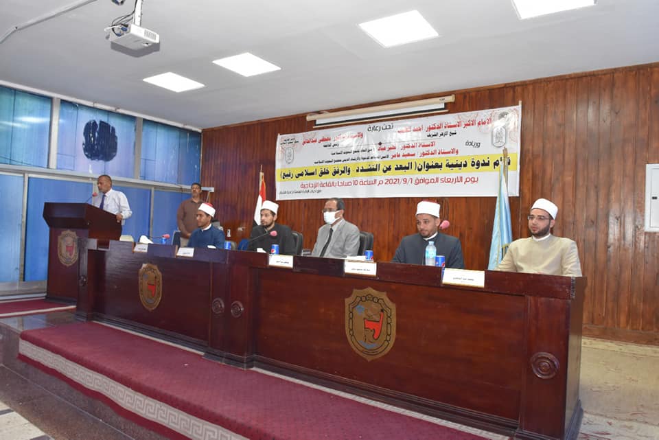 وفى كلمته رحب الدكتور مصطفي عبد الخالق، بضيوف الجامعة من الواعظين بالأزهر الشريف، من محافظتي سوهاج والأقصر، مؤكداً على الدور التوعوي الذى تقوم به الجامعة تجاه منتسبيها والمجتمع الخارجي، من خلال استضافة المختصيين من العلماء ورجال الدين، لتصحيح المفاهيم الإسلامية والأحكام الشرعية المغلوطة لدي البعض، ونبذ التطرف والتشدد الديني الذي تعاني منه مجتمعاتنا العربية، موضحاً أن الندوة أكدت أن التشدد والعنف مخالف للفطرة الإنسانية ومناقض لقواعد كل الأديان السماوية، كما دعت إلى التمسك بمكارم الأخلاق فالله تعالي رحيم بخلقه، رؤوف بعباده، كريم فى عفوه، رفيق فى أمره ونهيه، ولا يكلف نفساً إلا وسعها.