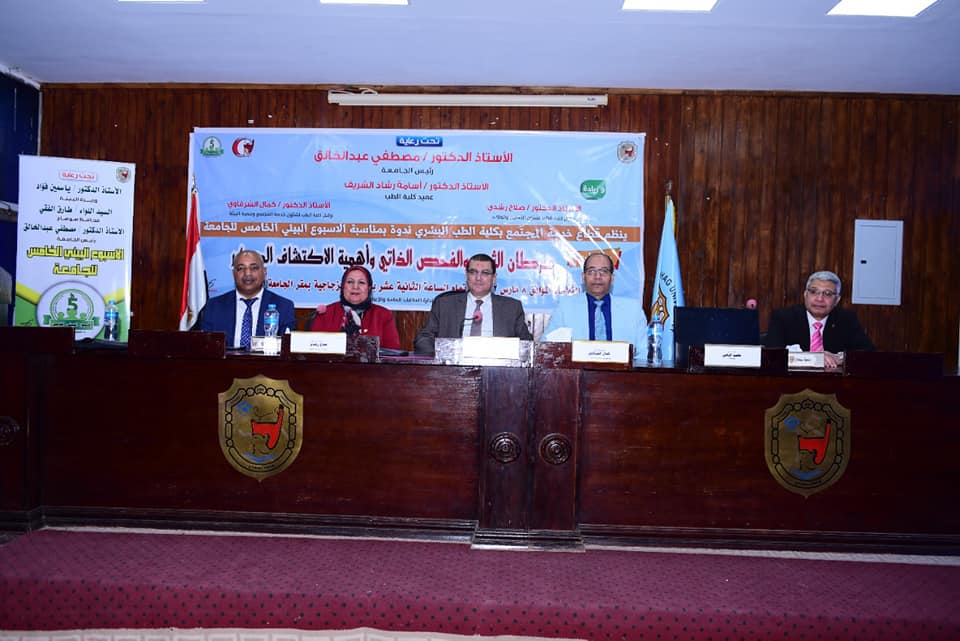 نظم قطاع خدمة المجتمع وتنمية البيئة بكلية الطب البشري بجامعة سوهاج، ندوة توعوية عن أورام الثدي، وذلك بحضور الدكتور أسامة رشاد الشريف القائم بعمل عميد الكلية، والدكتور كمال الشرقاوي وكيل الكلية لخدمة المجتمع وتنمية البيئة، والدكتورة صباح صابر منسق الأسبوع البيئي، والدكتور محمد توفيق المشرف على تنفيذ الأسبوع، ونخبة من أعضاء هيئة التدريس والطلاب وأعضاء الهيكل الإداري من مختلف كليات الجامعة.
