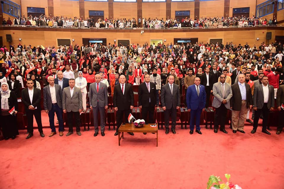 وفي بداية كلمته وجه الدكتور حسان النعماني رسالة تحية وتقدير للرئيس عبد الفتاح السيسي قائد المسيرة بمصر العظيمة وحامياً لها وقائداً لشعبها، وقال ان طلاب من اجل مصر قامت بتنظيم هذا الحفل تزامناً مع ذكري ميلاد الرئيس عبد الفتاح السيسي متمنين دوام التقدم لفخامته والازدهار لشعب مصر العظيم ، حيث ان الهدف من هذا الاحتفال تعريف شباب وطلاب الجامعة ما تحقق علي مدار السنوات الاخيرة من انجازات متلاحقة والجهود التنموية المبذولة في كافه أنحاء الجمهورية من اجل اعادة بناء مصر وتقديمها بشكل أفضل للعالم.