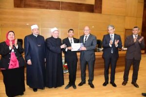 الدكتور شوقي علام مفتي الديار المصرية والدكتور محمد عبد المالك نائب رئيس جامعة الازهر بأسيوط والوجه القبلي نيابة عن الشيخ احمد الطيب شيخ الازهر والدكتور طارق سعده نقيب الاعلاميين.