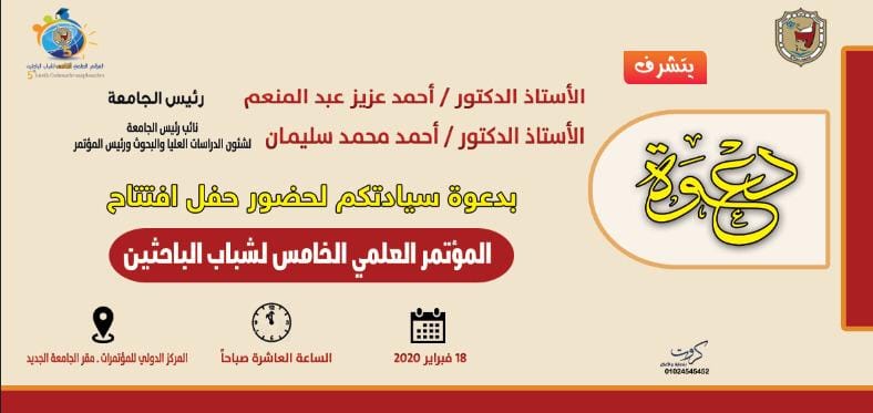 تنظم جامعة سوهاج  غداً الثلاثاء ١٨ من فبراير المؤتمر العلمى الخامس لشباب الباحثين، والذي يستمر علي مدار يومين، وذلك في تمام الساعة العاشرة صباحاً بالمركز الدولى للمؤتمرات بمقر الجامعة الجديد.