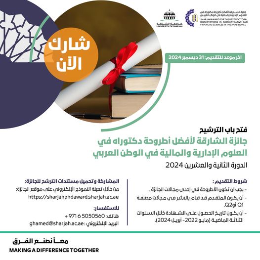 تعلن المنظمة العربية للتنمية الإدارية عن فتح باب الترشح “لجائزة الشارقة لأطروحات الدكتوراه في العلوم الإدارية والمالية في الوطن العربي”، للدورة الثانية والعشرين.