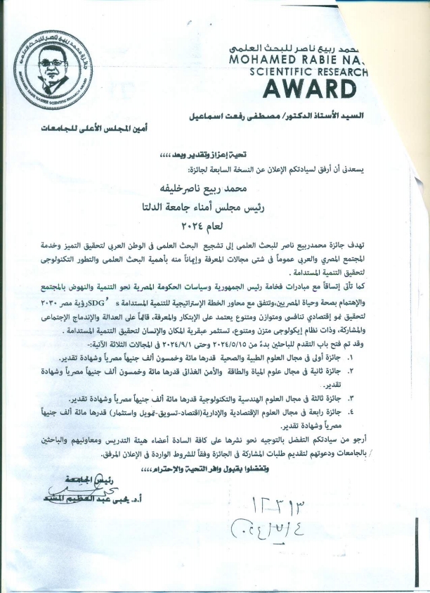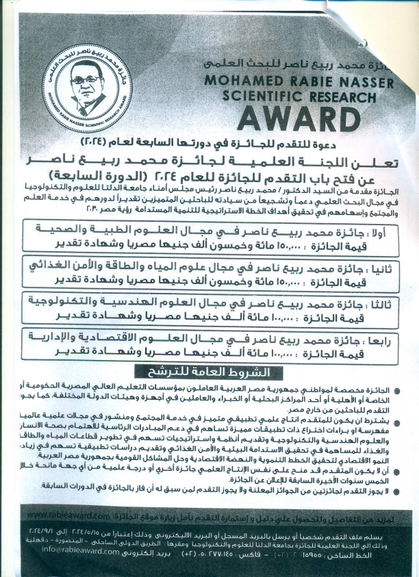تعلن اللجنة العلمية لجائزة محمد ربيع ناصر خليفة عن فتح باب التقدم للجائزة للعام 2024 (الدورة السابعة)، في الفترة من 15/ 5/ 2024 حتى 1/ 9/ 2024 ، وذلك في المجالات التالية :