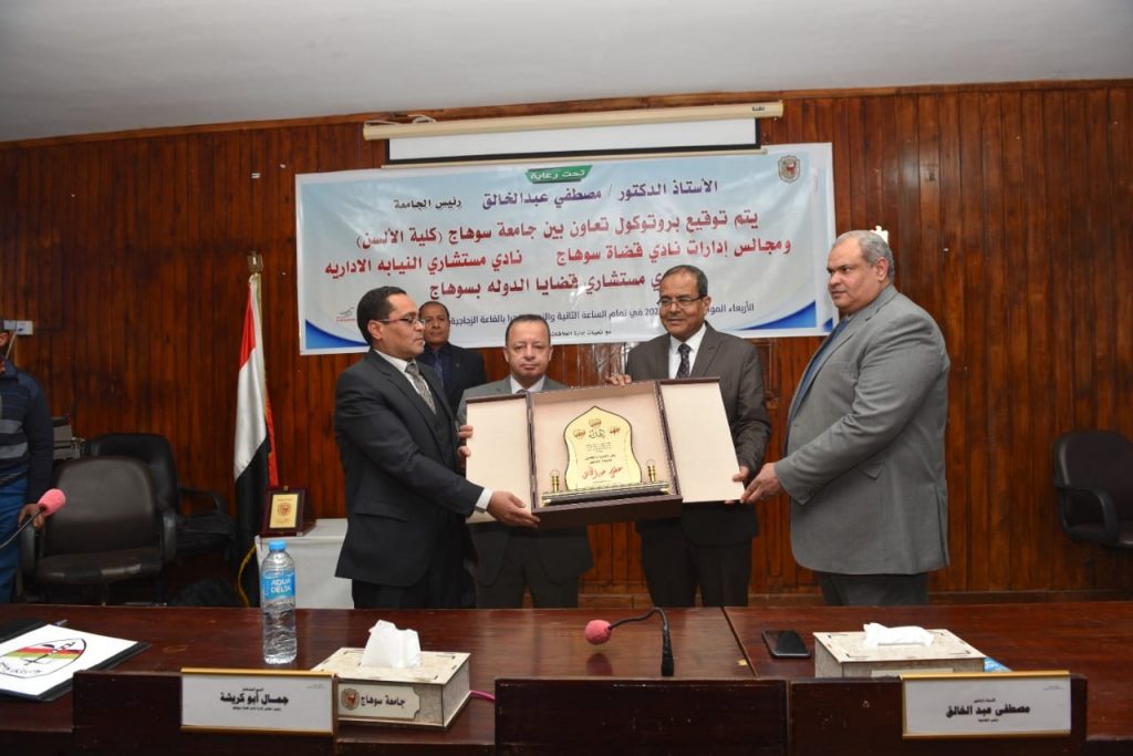 وقع الدكتور مصطفى عبدالخالق رئيس جامعة سوهاج، بروتوكول تعاون مع ممثلى مجالس ادارات نوادى الهيئات القضائية الثلاث “نادى قضاة سوهاج ونادى مستشارى النيابات الادارية ونادى مستشارى هيئة قضايا الدولة”، بهدف عقد دورات تدريبية في مختلف التخصصات، وتبادل الخبرات العلمية والثقافية، وذلك بالقاعة الزجاجية بالحرم الجامعي القديم، بحضور الدكتور عبدالناصر يس نائب رئيس الجامعة للتعليم والطلاب، والمستشار خالد عبدالغفار وكيل نادي القضاة بسوهاج، والمستشار محمد عميرة رئيس نادي هيئة النيابة الإدارية، والمستشار أيمن شكر رئيس نادي هيئة قضايا الدولة، والدكتور صبري توفيق القائم بعمل عميد كلية الألسن، ولفيف من أعضاء الهيئات القضائية، وأعضاء هيئة التدريس بالجامعة.