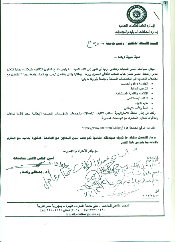 وفقا لبروتكول التعاون بين الجامعات المصرية و جامعة روما الايطالية و سعيا لإقامة شراكات و اتفاقات تعاون مشترك مع الجامعات المصرية و خصوصا جامعة سوهاج فقد تم فتح باب الاستعداد العلمى للتعاون فى المجالات الاتية :