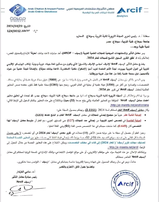 أعلن الدكتور حسان النعماني رئيس جامعة سوهاج عن حصول المجلة التربوية لكلية التربية بالجامعة علي المرتبة الخامسة فى تخصص العلوم التربوية من إجمالى 127 مجلة على مستوى العربى، وذلك وفق التقرير السنوي التاسع لعام 2024م الذى يصدره معامل التأثير والاستشهادات المرجعية للمجلات العلمية العربية (ARCIF – أرسيف)، لتأتي في صدارة المجلات التربوية فى العالم العربى.
