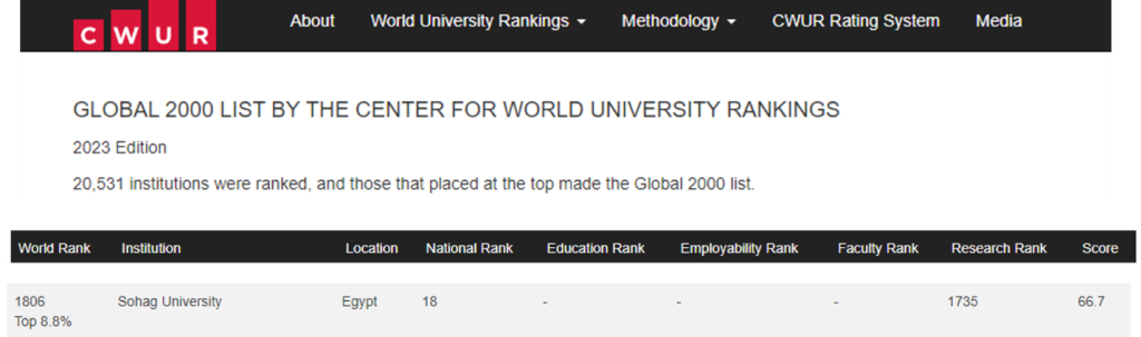 حصلت جامعة سوهاج في تصنيف 2023 علي المركز 1806 عالميا و المركز 18 علي مستوي جمهورية مصر العربية.