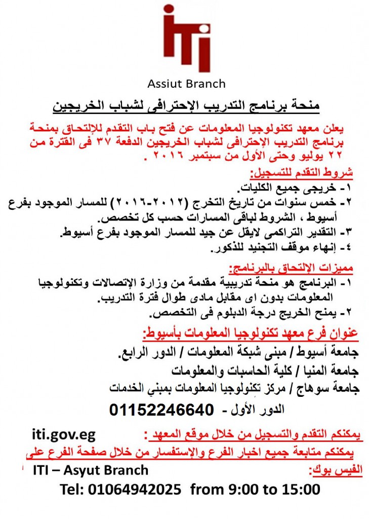 ويمكنكم الاستفسار ومتابعه التفاصيل من خلال صفحه الفرع علي الفيس بوك :https://www.facebook.com/ITI-Asyut-Branch-1552000711689894/ او الاتصال برقم 01064942025 من الساعه التاسعه صباحاً حتي الثالثة عصراً.