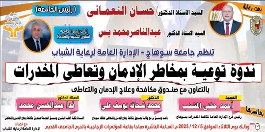 تنظم الادارة العامة لرعاية الشباب جامعة سوهاج ندوة توعية بمخاطر الإدمان وتعاطي المخدرات وذلك بالتعاون مع صندوق مكافحة وعلاج الإدمان والتعاطي، يوم الثلاثاء الموافق 5 ديسمبر الجاري في تمام الساعة العاشرة صباحا بقاعة المؤتمرات الزجاجية بالحرم الجامعي القديم .