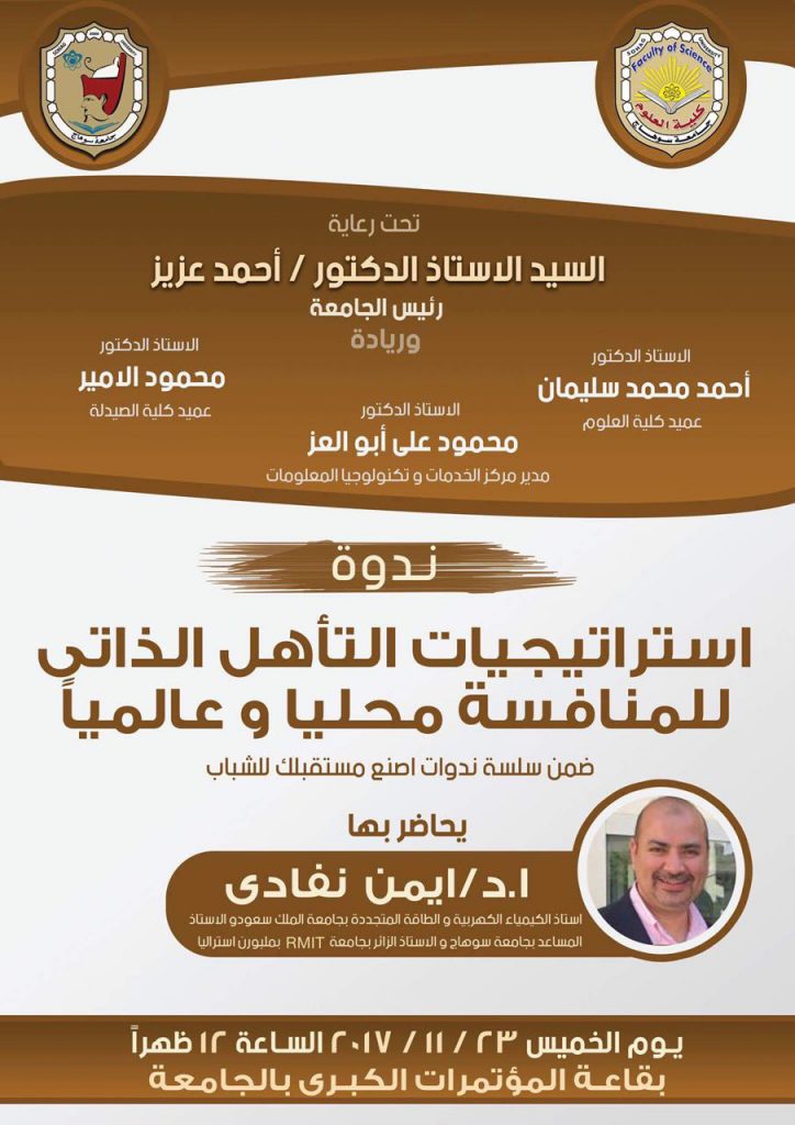 تحت رعاية الاستاذ الدكتور احمد عزيز رئيس الجامعة و الاستاذ الدكتور احمد محمد سليمان عميد كلية العلوم و الاستاذ الدكتور محمود الامير عميد كلية الصيدلة و الاستاذ الدكتور محمود على أبو العز مدير مركز الخدمات و تكنولوجيا المعلومات سوف يتم عقد ندوة بعنوان ” استراتيجيات التأهل الذاتى للمنافسة محليا و عالميا ” تحت اشراف المدرب الدكتور أيمن نفادى استاذ الكيمياء الكهربية و الطاقة المتجددة بجامعة الملك سعود و ذلك يوم الخميس 23/11/2017 فى تمام الساعة 12 ظهرا بقاعة المؤتمرات الكبرى بالجامعة.