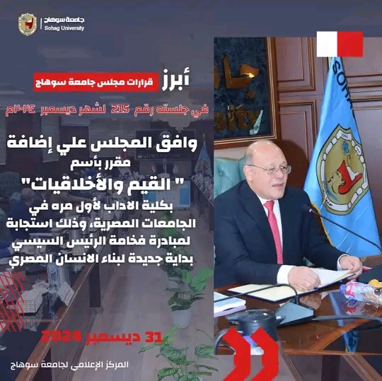 وافق المجلس علي إضافة مقرر بأسم” القيم والأخلاقيات” بكلية الاداب لأول مره في الجامعات المصرية، وذلك استجابة لمبادرة فخامة الرئيس السيسي بداية جديدة لبناء الانسان المصري.