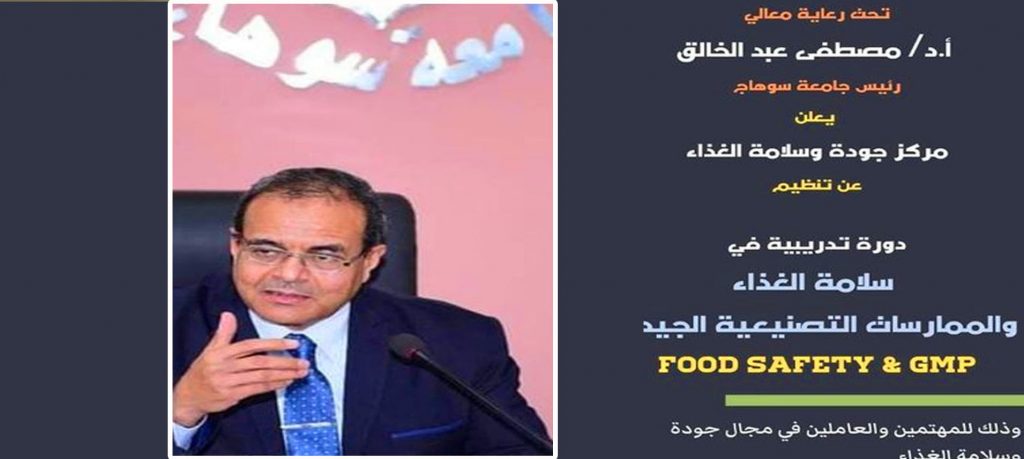 تحت رعاية الدكتورمصطفي عبد الخالق ، رئيس جامعة سوهاج ،يعلن مركز جودة وسلامة الغذاء بجامعة سوهاج، عن فتح باب التسجيل للدورة التدريبية”سلامة الغذاء والممارسات التصنيعية الجيدة GMP”، والتي تستهدف كلاً من طلاب كليات الطب البيطري، والزراعة، والصيدلة، والعلوم، والتربية النوعيه وكل الكليات التي لها مجال فى التعامل مع الأغذية، والخريجين.