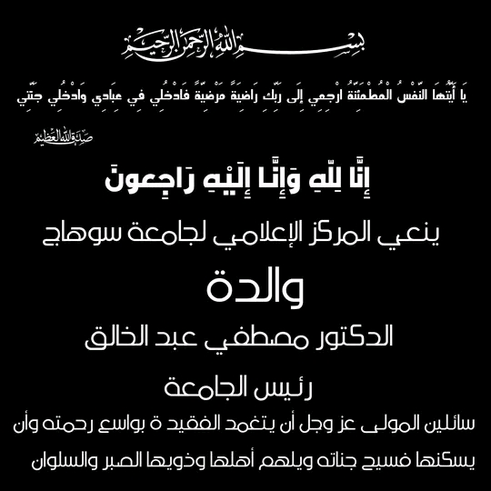 ينعي المركز الإعلامي لجامعة سوهاج ” والدة ” الدكتور مصطفي عبد الخالق رئيس جامعة سوهاج سائلين المولى عز وجل أن يتغمد الفقيدة بواسع رحمته وأن يسكنها فسيح جناته ويلهم أهلها وذويها الصبر والسلوانإنا لله وإنا إليه راجعون