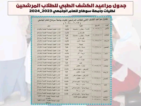 أعلن الدكتور حسان النعماني رئيس جامعة سوهاج، مواعيد الكشف الطبي للطلاب والطالبات الجدد الحاصلين على الشهادة الثانوية العامة لهذا العام، والمرشحين من مكتب التنسيق للقبول بمختلف كليات الجامعة للعام الجامعى 2023/2024، حيث تم إعلان الجدول الخاص بالأيام المحددة لطلاب كل كلية، وذلك لإجراء الكشف الطبي لهم بالإدارة الطبية بالمقرين القديم والجديد للجامعة.