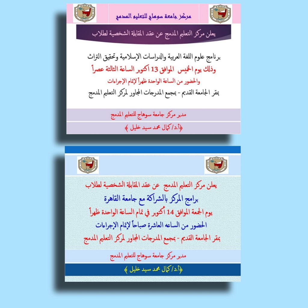 تبدأ اليوم جامعة سوهاج، اختبارات المقابلة الشخصية للمتقدمين للإلتحاق ببرامج التعليم المدمج، بالشراكة مع جامعتي القاهرة والمنيا، والتي ستعقد بمجمع المدرجات بمقر الجامعة القديم، صرح بذلك الدكتور مصطفي عبد الخالق رئيس الجامعة، وقال أن عدد الطلاب المتقدمين للإلتحاق ببرنامج التعليم المدمج تجاوز هذا العام ٨٠٠ طالب وطالبة، مضيفاً أن اختبارات المقابلة الشخصية ستتم على يومي الخميس والجمعة ١٣ و١٤ من أكتوبر الجاري.