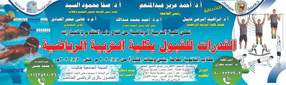 أعلن الدكتور أحمد عزيز عبد المنعم رئيس جامعة سوهاج، عن موعد إختبارات القدرات المؤهلة للإلتحاق بكلية التربية الرياضية، والتي تبدأ اعتباراً من ٨ أغسطس القادم وتستمر حتي ٢٠ من نفس الشهر.
