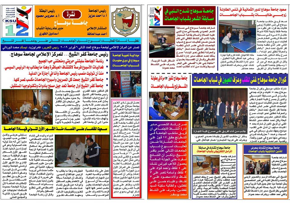 إصدار العدد الجديد للمركز الاعلامي علي هامش اسبوع شباب الجامعات بكفر الشيخ عدد يصدر عن المركز الاعلامي للجامعة علي هامش اسبوع شباب الجامعات بكفر الشيخ