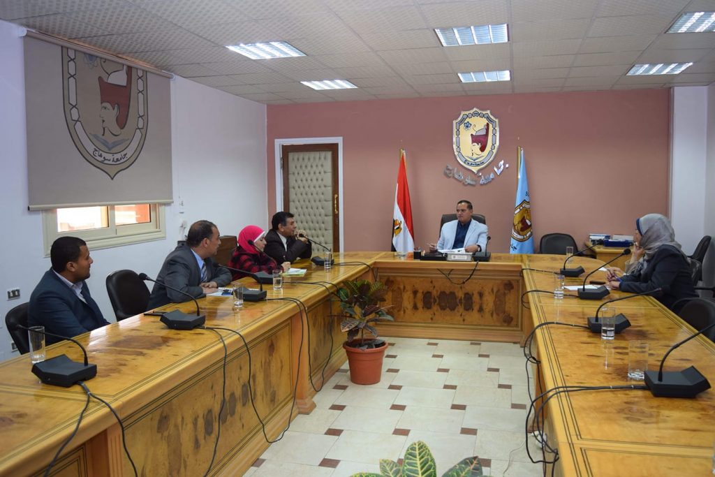 عقد الدكتور احمد عزيز رئيس جامعة سوهاج اجتماع مع جمعية تنمية وحماية البيئة بسوهاج برئاسة الدكتور احمد حسانين استاذ بكلية العلوم و رئيس الجمعية، والتي مقرها كلية العلوم، تناول الاجتماع عدد من الموضوعات ذات التعاون المشترك وآليات تنفيذها خلال المرحلة القادمة .