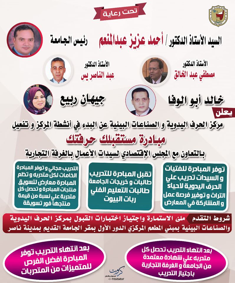مبادرة مستقبلك حرفتك يعلن مركز الحرف اليدوية و الصناعات البيئية عن بدء أنشطة المركز و تفعيل مبادرة مستقبلك حرفتك بالتعاون مع المجلس الالقتصادى لسيدات الاعمال باغرفة التجارية .