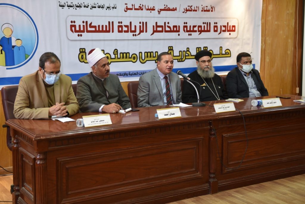 وفي كلمته أشار رئيس الجامعة إلى أن المشكلة السكانية نسبية وتتعلق بتعداد الدولة وما يقابله من الموارد الطبيعية والمالية والصناعية، مضيفاً أن الدولة لا تفرض فكر معين على أفرادها ولكنها تنشر دعوة للتوعية بأضرار كثرة الإنجاب ومخاطره على صحة الأم والأبناء، موضحاً أن الفترة الحالية تتطلب حملات موجهة للقرى الأكثر انجاباََ، وللمواطن المصري البسيط من خلال نقل الصورة الكاملة له بمخاطر الزيادة السكانية على أسرته وتوضيح عواقبها الصحية والاجتماعية، مطالباََ بضرورة التوعية بالتخلي عن العادات والتقاليد القديمة المتوارثة عن كثرة الأبناء الذي يعد أحد الأسباب الرئيسية في زيادة أعداد السكان بهذا الشكل المخيف، وبضرورة وضع خطط مستقبلية لوقف هذا الانفجار السكاني الذي أصبح يمثل تهديداََ واضحاََ لكل محاولات التنمية والإصلاح.