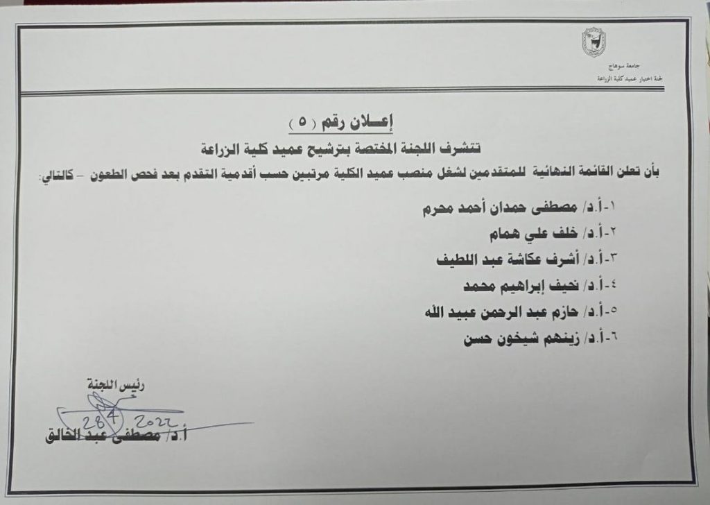 القائمة النهائية للمتقدمين لشغل منصب عميد كلية الزراعة مرتبين حسب اقدمية التقدم بعد فحص الطعون القائمة النهائية للمتقدمين لشغل منصب عميد كلية الزراعة مرتبين حسب اقدمية التقدم بعد فحص الطعون