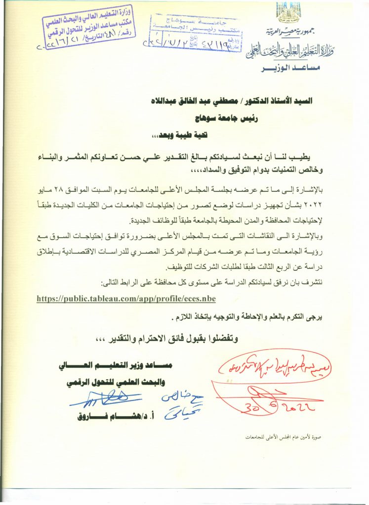 استقبل الاستاذ الدكتور مصطفي عبد الخالق رئيس الجامعة قرار مساعد وزير التعليم العالى و البحث العملي للتحول الرقمي الاستاذ الدكتور هشام عبد الخالق بشأن تجهيز دراسات لوضع تصور من احتياجات الجامعات من الكليات الجديدة طبقا لاحتياجات المحافظة و المدن المحيطة بالجامعة طبقا للوظائف الجديدة كما هو مرفق .