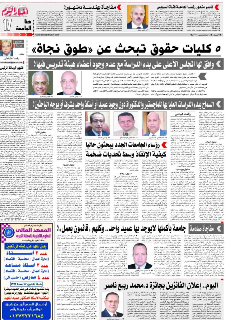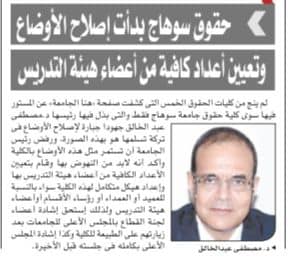 وأضاف عبد الخالق، أن كلية الحقوق من الكليات المميزة والقوية، حيث مرت بفترات عصيبة منذ افتتاحها في العام الدراسي ٢٠١٤/ ٢٠١٥، وذلك نظراً لندرة أعداد أعضاء هيئة التدريس بها، مما اضطر إدارة الجامعة إلى إسناد قيادة الكلية لأحد الأساتذة من كلية الزراعة، الأمر الذي دعا الكاتب الصحفى الكبير الأستاذ رفعت فياض أن يهاجمها فى عدد أخبار اليوم بتاريخ السبت ١٨ ديسمبر ٢٠٢١ ويصفها بأنها تعانى ضمن خمسة من نظيراتها فى الجامعات المصرية، مشيراً إلى أنه منذ ذلك التاريخ وضعت إدارة الجامعة خطة طموحة وسريعة، لاستيفاء أعداد أعضاء هيئة التدريس بالكلية، عن طريق فتح باب النقل والندب الكلى للراغبين من منسوبى الكلية بالجامعات المصرية الأخرى.