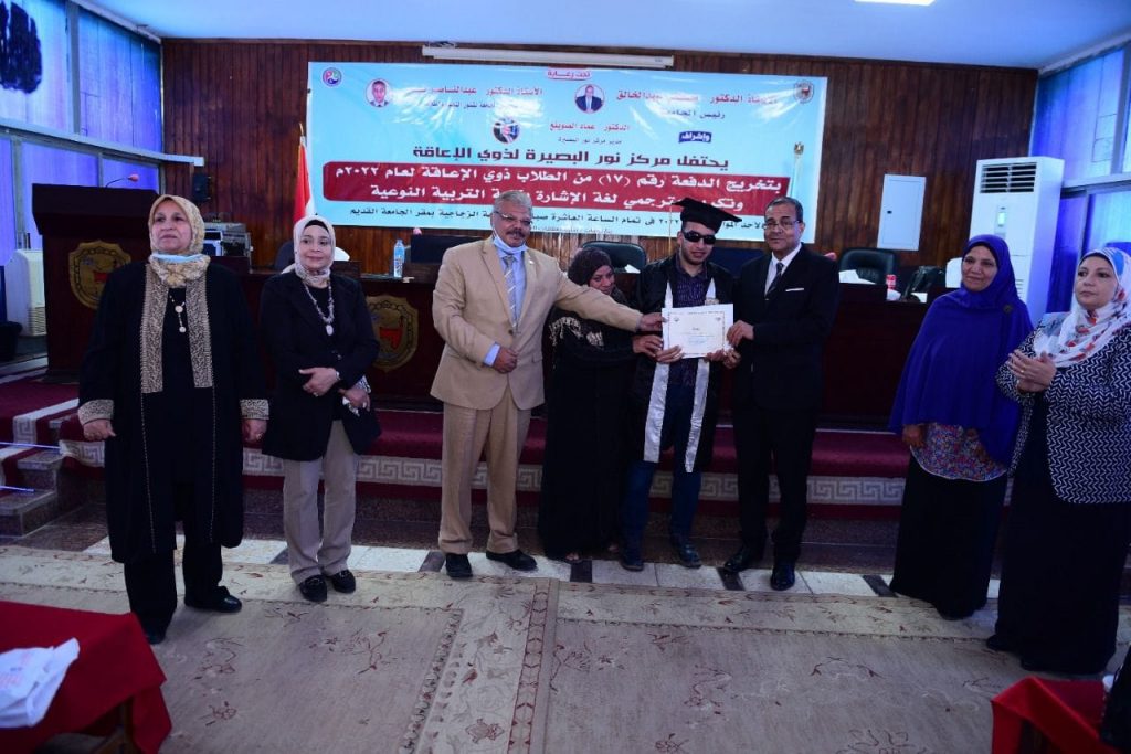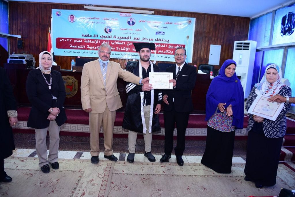 شهد الدكتور مصطفي عبد الخالق رئيس جامعة سوهاج، حفل تخريج الدفعة ١٧ من الطلاب ذوي الإعاقة بمركز نور البصيرة وعددهم ١٧ طالب وطالبة عدد من الكليات المختلفة، وتكريم ٢٥ من مترجمي لغة الإشارة الذين تولوا الترجمة للغة الإشارة للطلاب الصم بكلية التربية النوعية، وذلك بحضور الدكتور عماد الصوينع مدير المركز، والدكتورة سلمي عبدالمنعم نائب مدير المركز، اللواء حاتم صادق مدير الأمن الجامعي، الدكتورة لمياء أبو زيد وكيل كلية التربية النوعية لشئون التعليم والطلاب، الدكتورة أميرة الطاهر مدير نادي ريادة الأعمال بالجامعة، وعدد من أعضاء هيئة التدريس و قيادات مديرية التربية والتعليم بالمحافظة، وذلك بالقاعة الزجاجية بالحرم الجامعي القديم.
