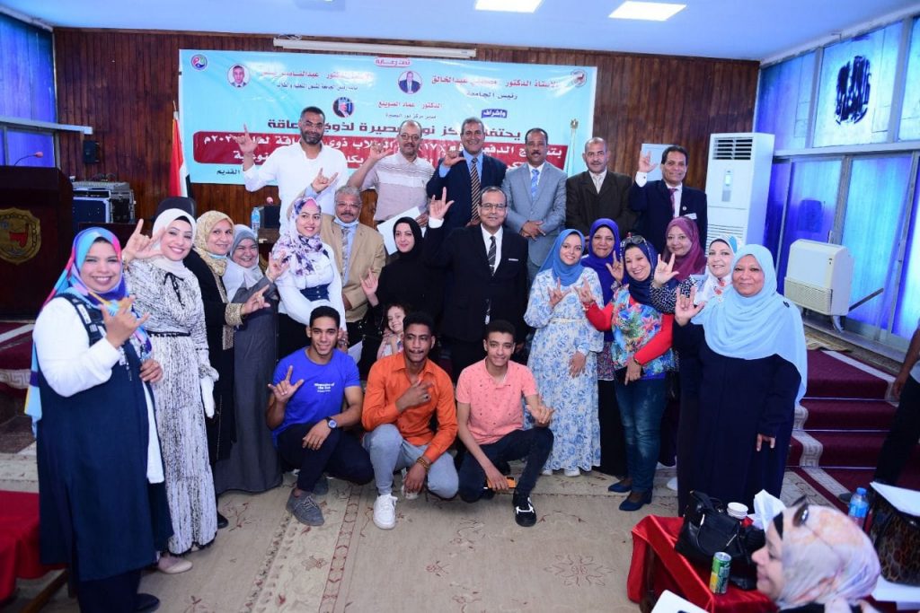 ومن جانبه، وجه الصوينع شكره لرئيس الجامعة لدعمه اللامحدود لطلاب مركز نور البصيرة، وأيضاً لمترجمي ومترجمات لغة الإشارة بكلية التربية النوعية لما بذلوه من جهود متميزة مع الطلاب الصم طوال فترة العام الدراسي، لافتاً إلى أن هذا اليوم يمثل حصاد جهود متواصلة لطلاب متميزين لديهم درجة عالية من الطموح والإرادة من أجل الوصول لأهدافهم، مناشداً كافة المسئولين بدمجهم في المجتمع وضمان كافة حقوقهم مثل أقرانهم من الأسوياء،.