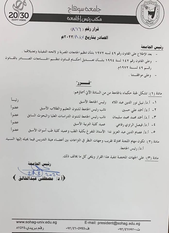 أصدر الدكتور مصطفي عبد الخالق رئيس جامعة سوهاج، قراراً بتشكيل لجنة حكماء بالجامعة، تكون مهمتها محاولة تقريب وجهات النظر وحل المشكلات البسيطة بين منسوبي الجامعة، فيما يحيله إليها رئيس الجامعة.