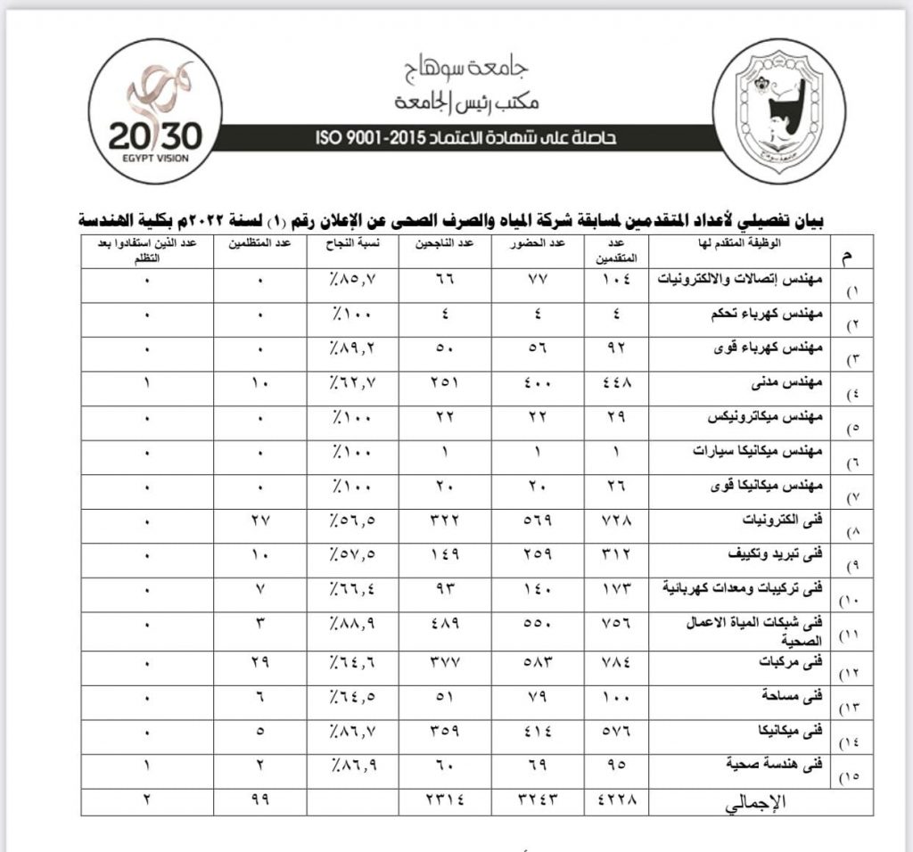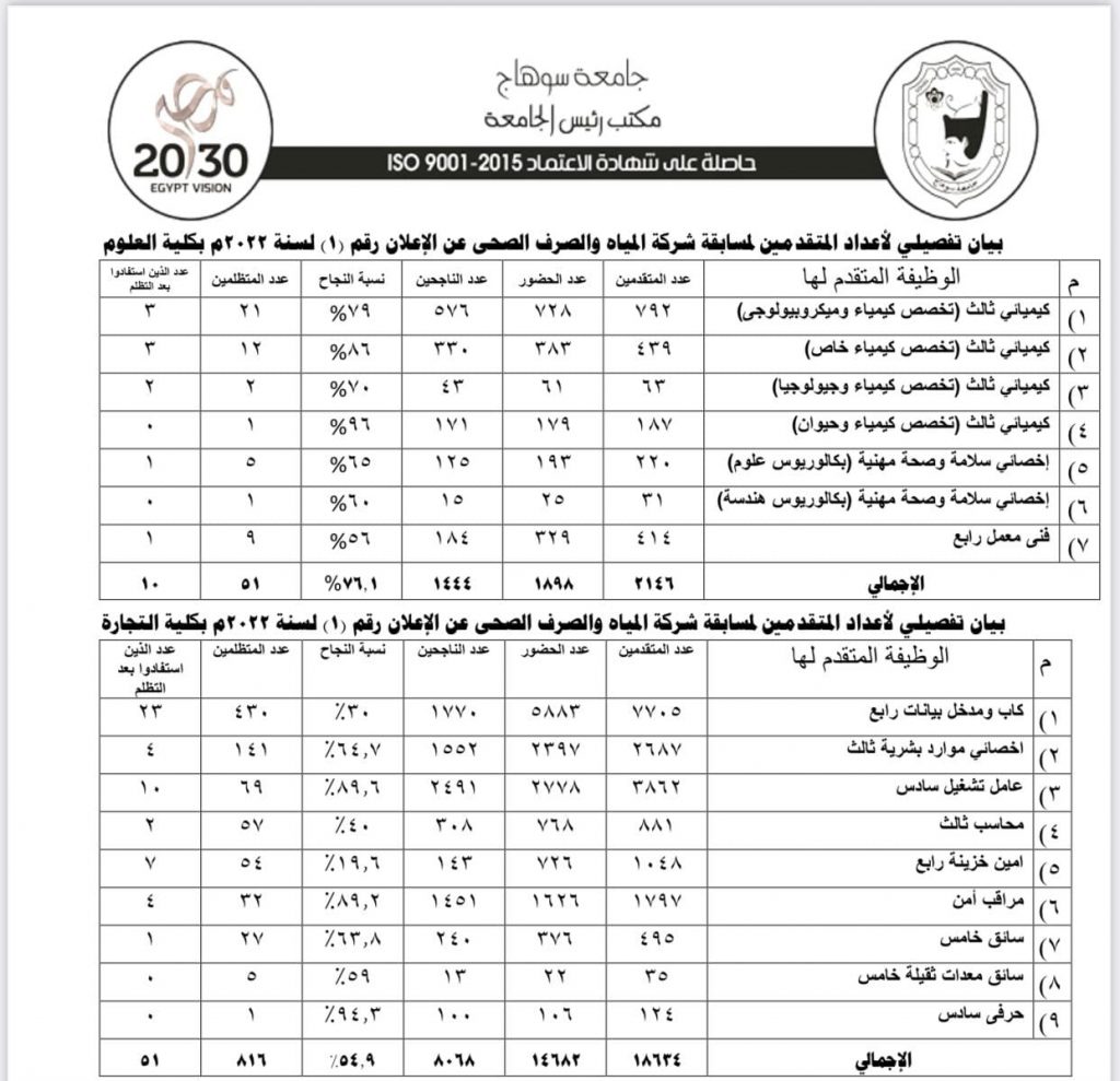 تفاصيل الأعداد والنسب المئوية للمتقدمين للوظائف المختلفة لمسابقة شركة مياه الشرب والصرف الصحي بسوهاج.