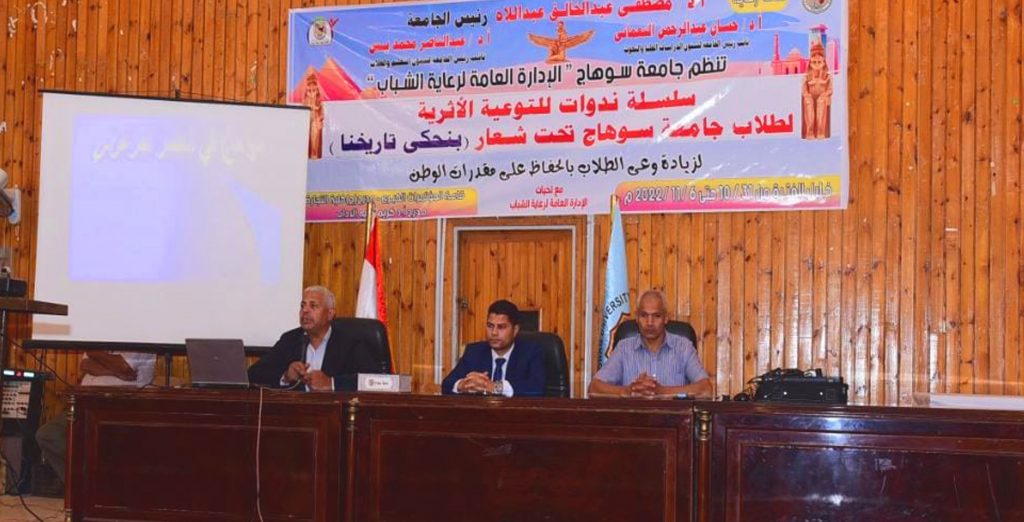 نظمت الإدارة العامة لرعاية الشباب المركزية بجامعة سوهاج بالتعاون مع كلية الآثار سلسلة ندوات لنشر الوعي الأثري لطلاب الجامعة تحت عنوان “بنحكي تاريخنا”، وذلك بمقري الجامعة القديم والجديد، صرح بذلك الدكتور مصطفى عبدالخالق رئيس الجامعة. وقال أن هذه الندوات تهدف إلى تنمية وعي الطلاب بآثار بلدهم وأهميتها التاريخية والحضارية وما تمثله من أحداث جسدت حضارة متكاملة، مما يعزز من إعلاء روح الانتماء والولاء لوطنهم.