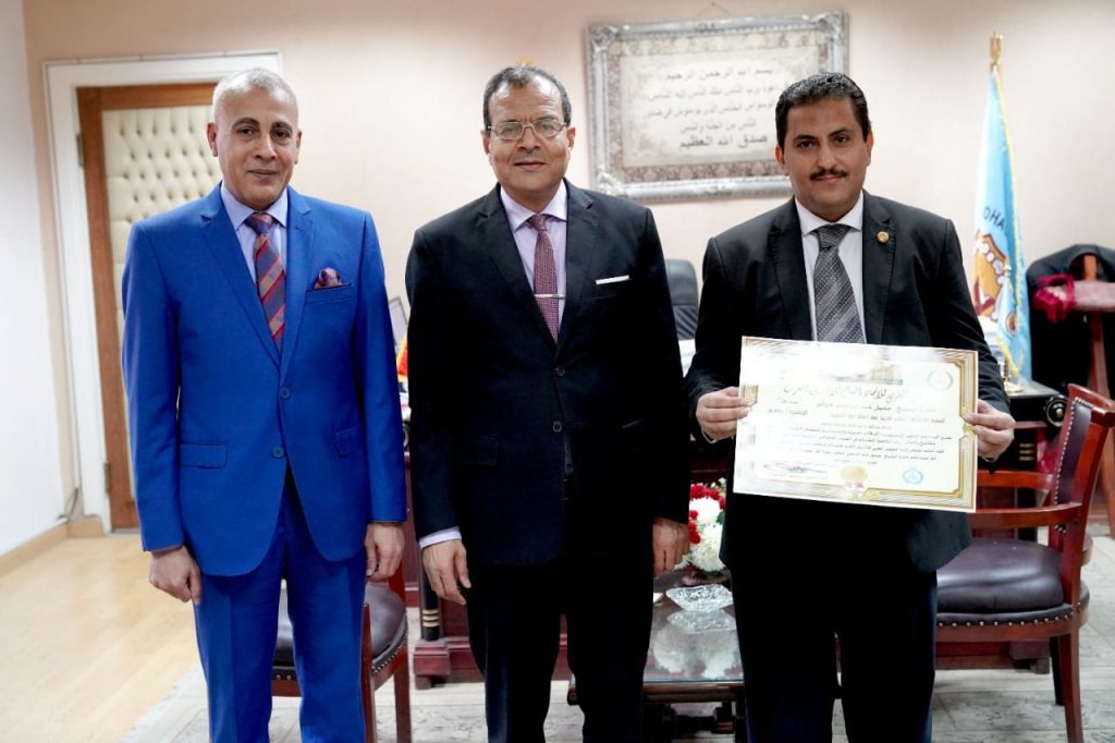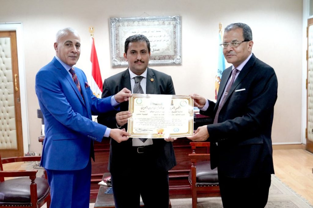 كرم الدكتور مصطفى عبد الخالق رئيس جامعة سوهاج والدكتور عبد الناصر يس نائب رئيس الجامعة لشئون التعليم والطلاب، الدكتور علاء الدين عبد العال عبد الحميد أستاذ الآثار الإسلامية المساعد ورئيس قسم الآثار الإسلامية بكلية الآثار، بمناسبة فوزه بجائزة الشيخ جميل عبد الرحمن خوقير “رحمه الله” المقدمة من المجلس العربي للاتحاد العام للآثاريين العرب، عن التراث والحضارة الإسلامية بمكة المكرمة “أم القرى”.