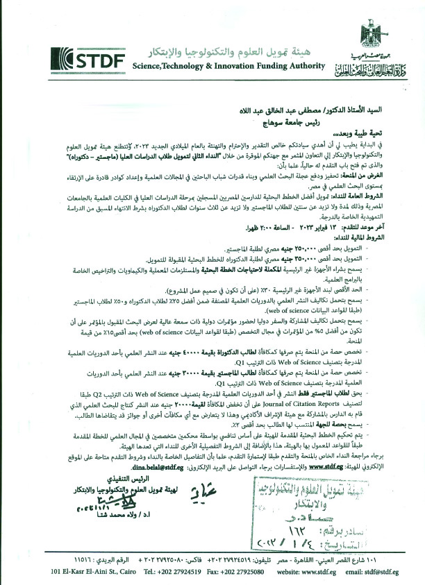 تعلن هيئة تمويل العلوم و التكنولوجيا و الابتكار عن انطلاق منحة ” النداء الثانى لتمويل طلاب الدراسات العليا ( ماجستير – دكتوراه ) بهدف بناء قدرات سباب الباحثين العملية و خلق كوادر للارتقاء بالبحث العلمى فى مصر و ذلك بدأ من اليوم حتى 13 فبراير 2023 فى تمام الساعة 2 ظهرا .