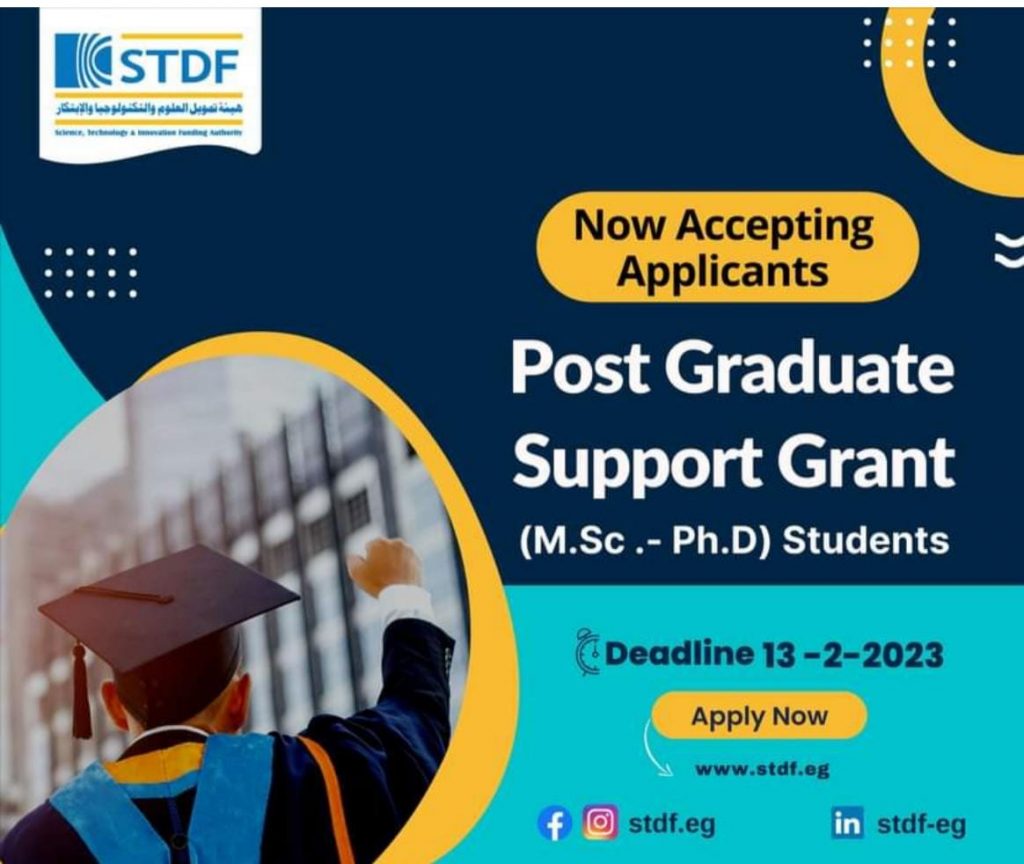 صرح الدكتور مصطفي عبدالخالق رئيس جامعة سوهاج ان هيئة تمويل العلوم والتكنولوجيا والابتكار (STDF) أطلقت عدة نداءات بحثية في مطلع شهر يناير ٢٠٢٣، وأشار رئيس الجامعة الي ان اخر موعد للتقدم للنداء الثاني لمنحة العلوم الاساسية ولمنحة تمويل طلاب الدراسات العليا سيكون ١٣ فبراير في تمام الساعة الثانية ظهرًا .