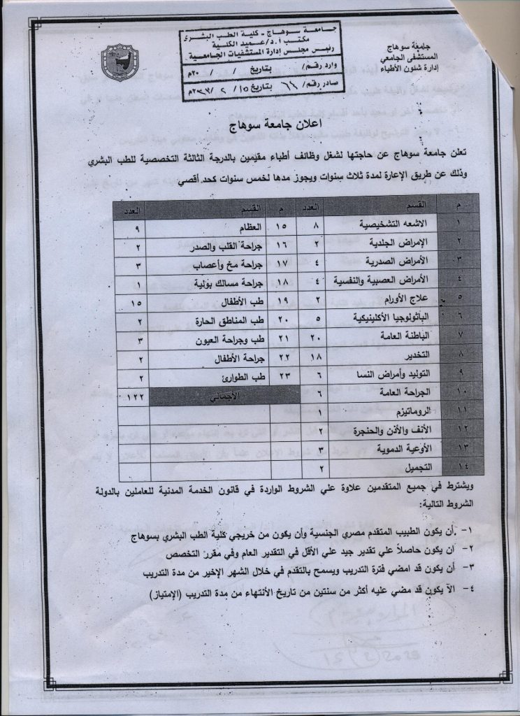 تعلن جامعة سوهاج ” المستشفي الجامعي بسوهاج ” عن حاجتها لشغل وظائف أطباء بالدرجة الثالثة التخصصية/ طب بشري وذلك عن طريق الاعارة لمدة ثلاث سنوات ويجوز مدها لخمس سنوات كحد أقصي .