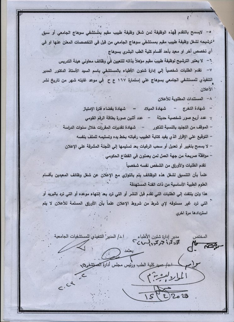 تقدم الطلبات شخصيًا الي إدارة شئون الأطباء بالمستشفي باسم السيد أ.د/ المدير التنفيذي للمستشفي الجامعي بسوهاج علي الاستمارة(167) ع.ح في موعد غايته شهر من تاريخ نشر الإعلان مرفقا به الطلبات الاتية:
