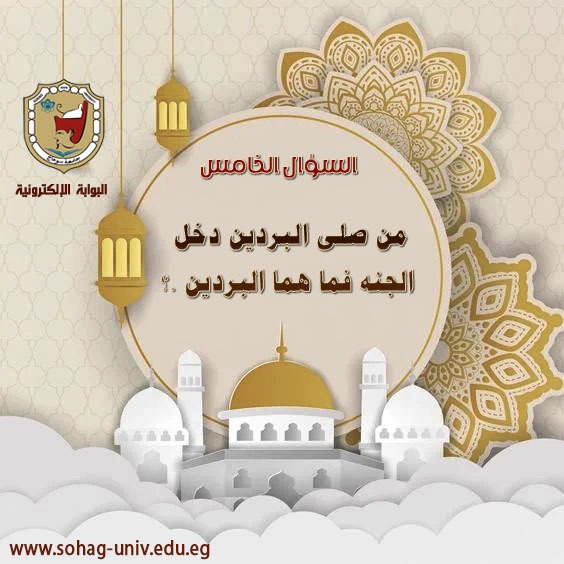 السؤال الخامس من المسابقة الرمضانية بسم الله الرحمن الرحيم السؤال الخامس من المسابقة الرمضانية :- من صلى البردين دخل الجنة فما هما البردين . ؟ #جامعة_سوهاج #المسابقة_الرمضانية #البوابة_الالكترونية