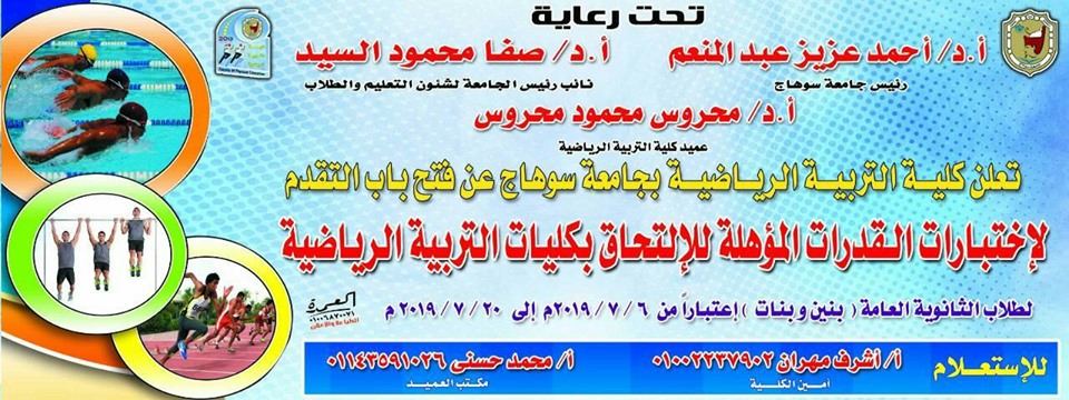 أعلن الدكتور أحمد عزيز رئيس جامعة سوهاج عن بدء إختبارات القدرات المؤهلة للإلتحاق بكلية التربية الرياضية بجامعة سوهاج والتي تبدأ من السبت الموافق 6 يوليو 2019 وتستمر الي 20 يوليو 2019 بالمدينة الجامعية للطالبات أمام المستشفي الجامعي بسوهاج.