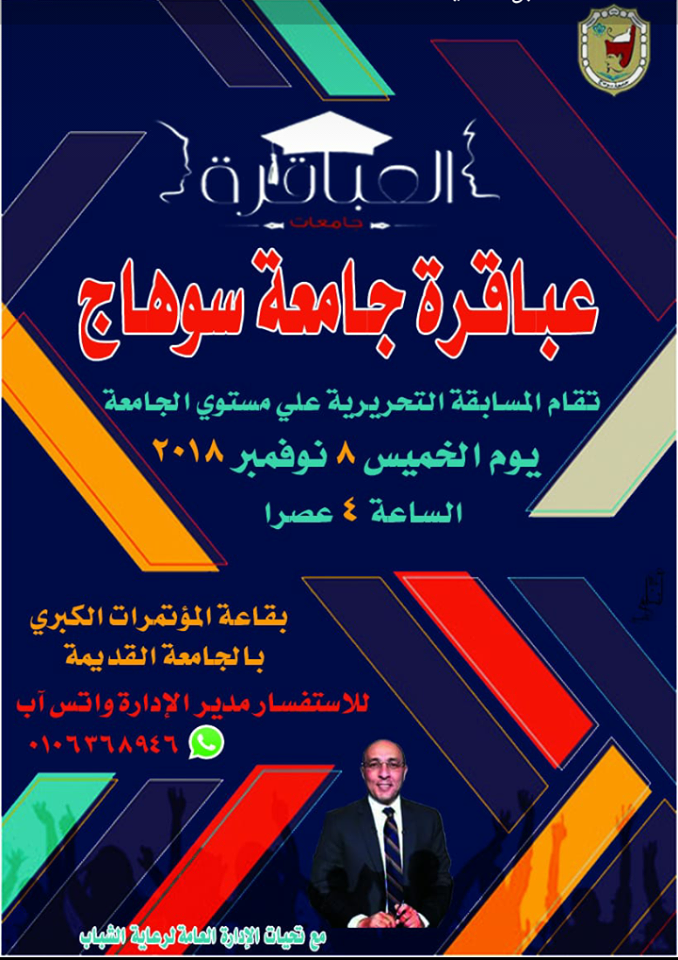أعلنت الادارة العامة لرعاية الشباب بجامعة سوهاج عن بدء المسابقة التحريرية لعباقرة الجامعة يوم الخميس الموافق 8 نوفمبر الجاري،في تمام الساعة الرابعة عصرًا، بقاعة المؤتمرات الكبري بمقر الجامعة القديم .