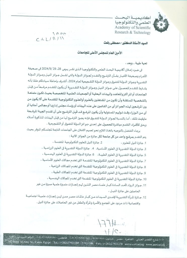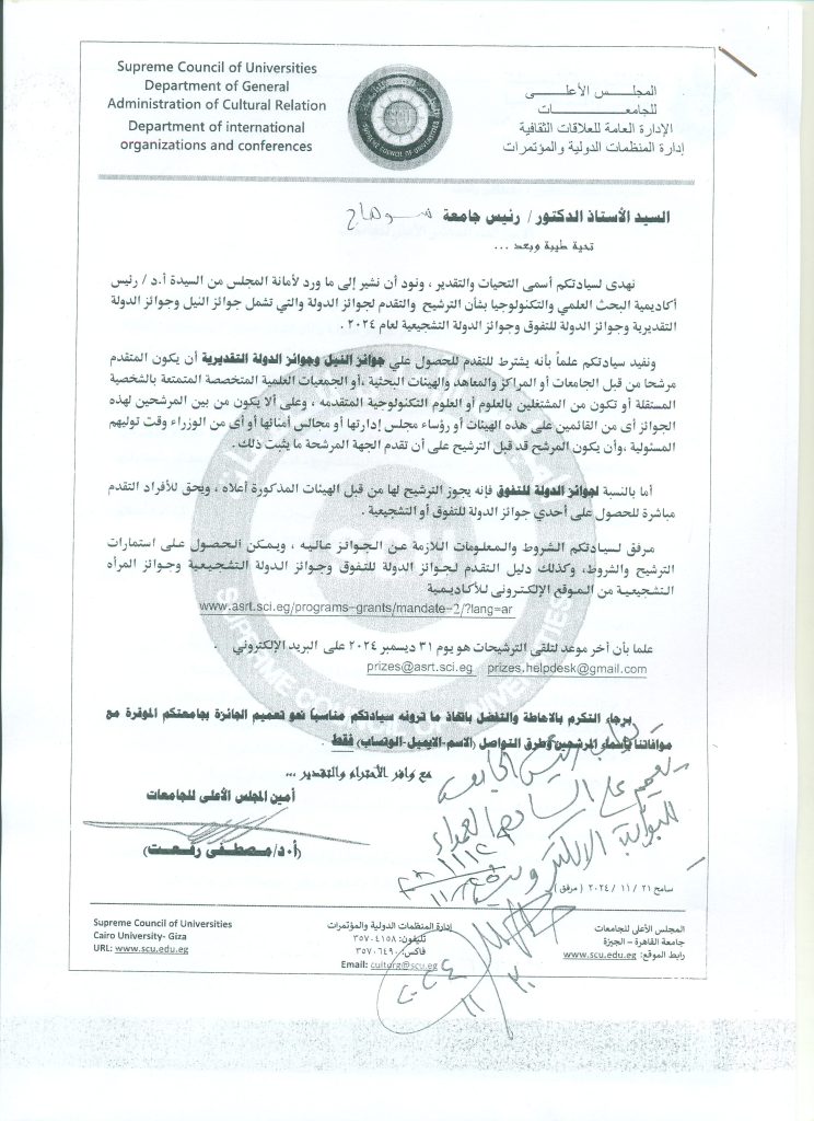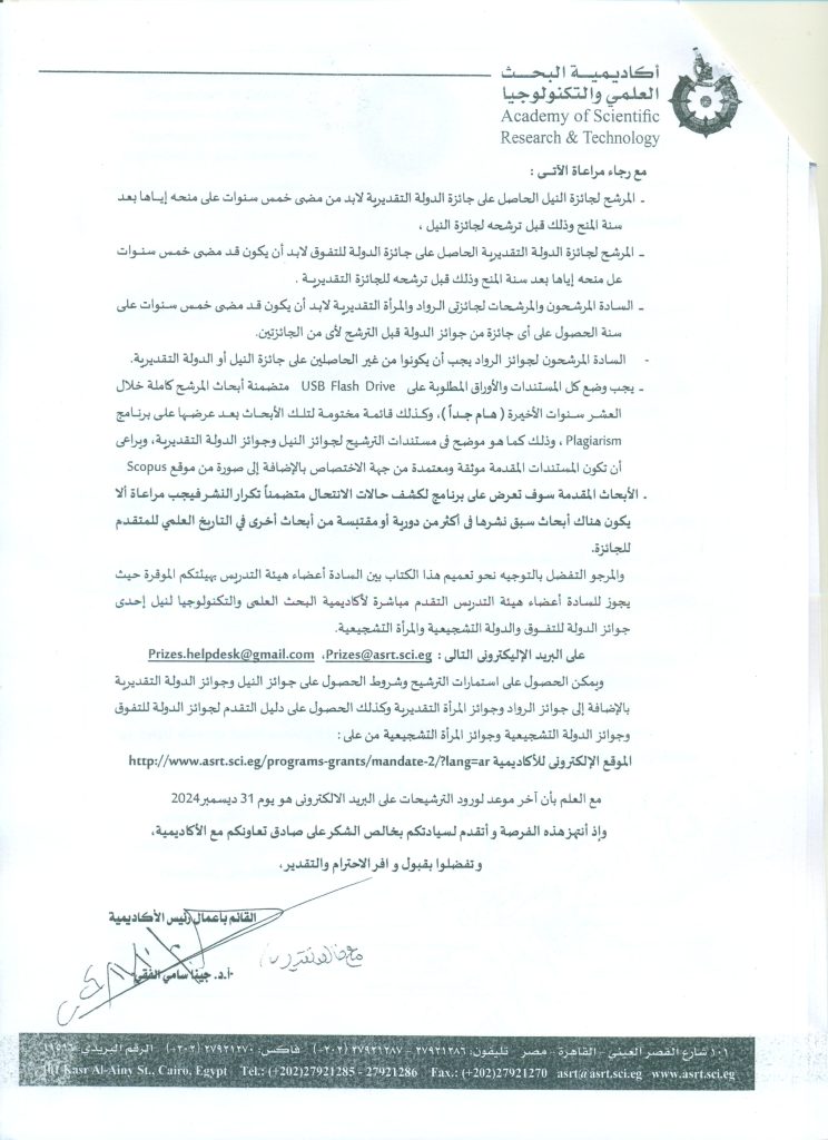 يشترط للترشيح و التقدم لجوائز الدولة والتي تشتمل جوائز النيل و جوائز الدولة التقديريه و جوائز الدولة للتفوق و جوائز الدولة التشجيعية لعام 2024
