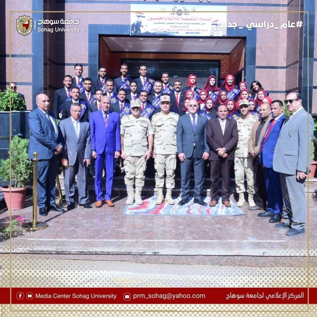 Prof. Hassan Al-Noamani, President of Sohag University, and Major General Staff Walid Hamid Al-Hamaki, Commander of the Popular and Military Defense Forces, witnessed the activities of the fifty-third educational symposium organized by the Armed Forces, represented by the Popular and Military Defense Forces, to educate students about the dangers that threaten national security, at the International Conference Center in the new headquarters,which coincided with the celebration of the golden jubilee to commemorate the victories of the glorious October War.