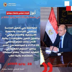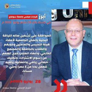مجلس جامعة سوهاج يقرر إعفاء أبناء الشهداء والمصابين من الرسوم الدراسية بنسبة ١٠٠%، وتسكين طلاب الجامعة الأهلية المغتربين بالمدن الجامعية