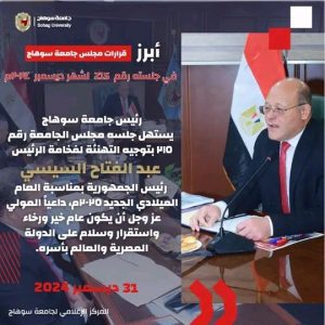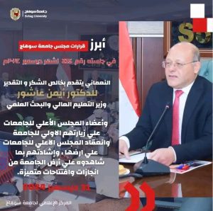 النعماني يتقدم بخالص الشكر و التقدير للدكتور أيمن عاشور وزير التعليم العالي والبحث العلمي وأعضاء المجلس الأعلي للجامعات علي زيارتهم الاولي للجامعة وانعقاد المجلس الاعلي للجامعات علي ارضها.