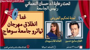 تحت رعاية الدكتور حسان النعماني رئيس جامعة سوهاج.. غدا انطلاق مهرجان تياترو الجامعة بحضور الفنان سامح حسين والفنانه لقاء سويدان بقاعة المؤتمرات الكبري بالحرم القديم في تمام الساعه ١٠صباحا.