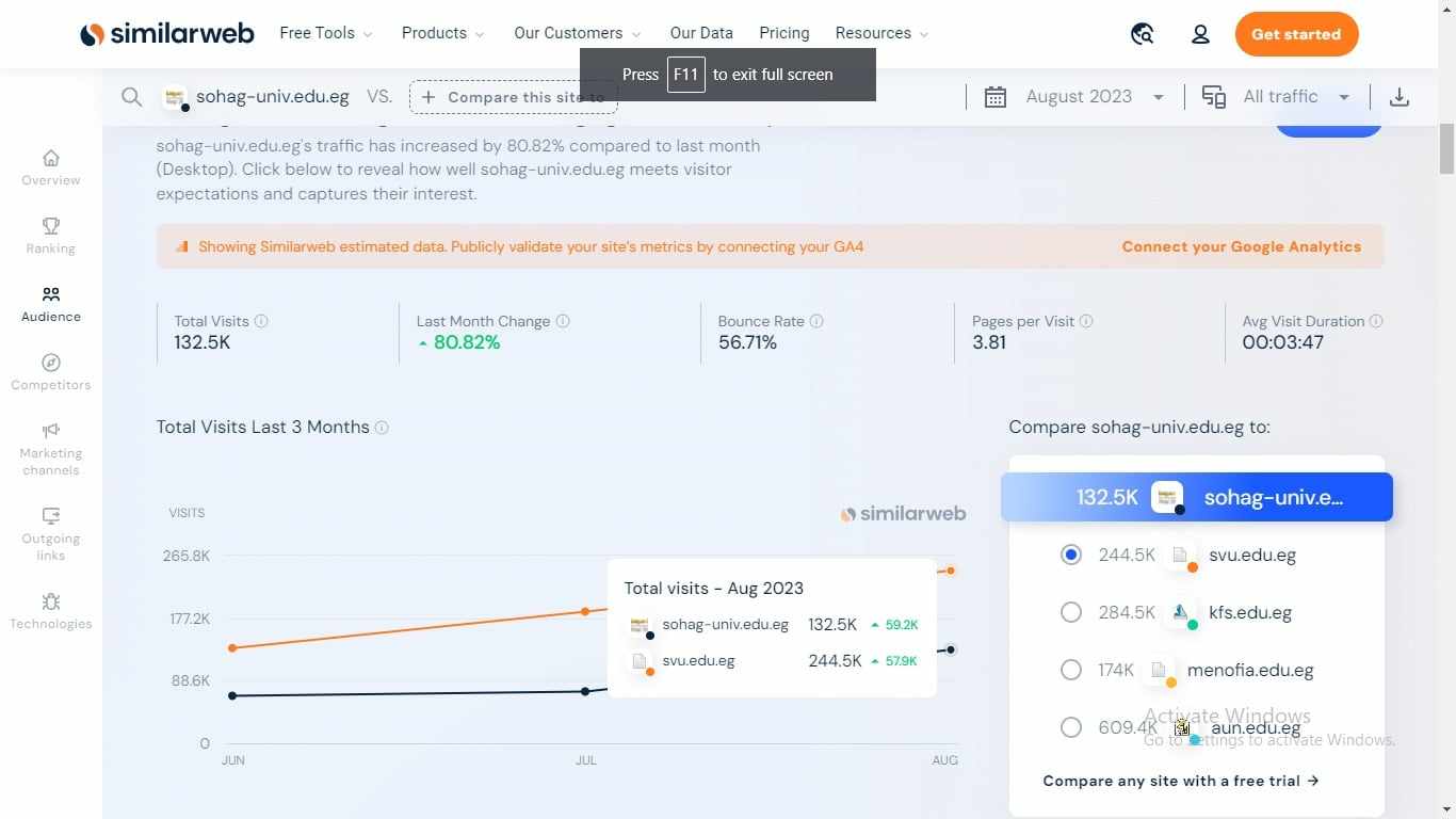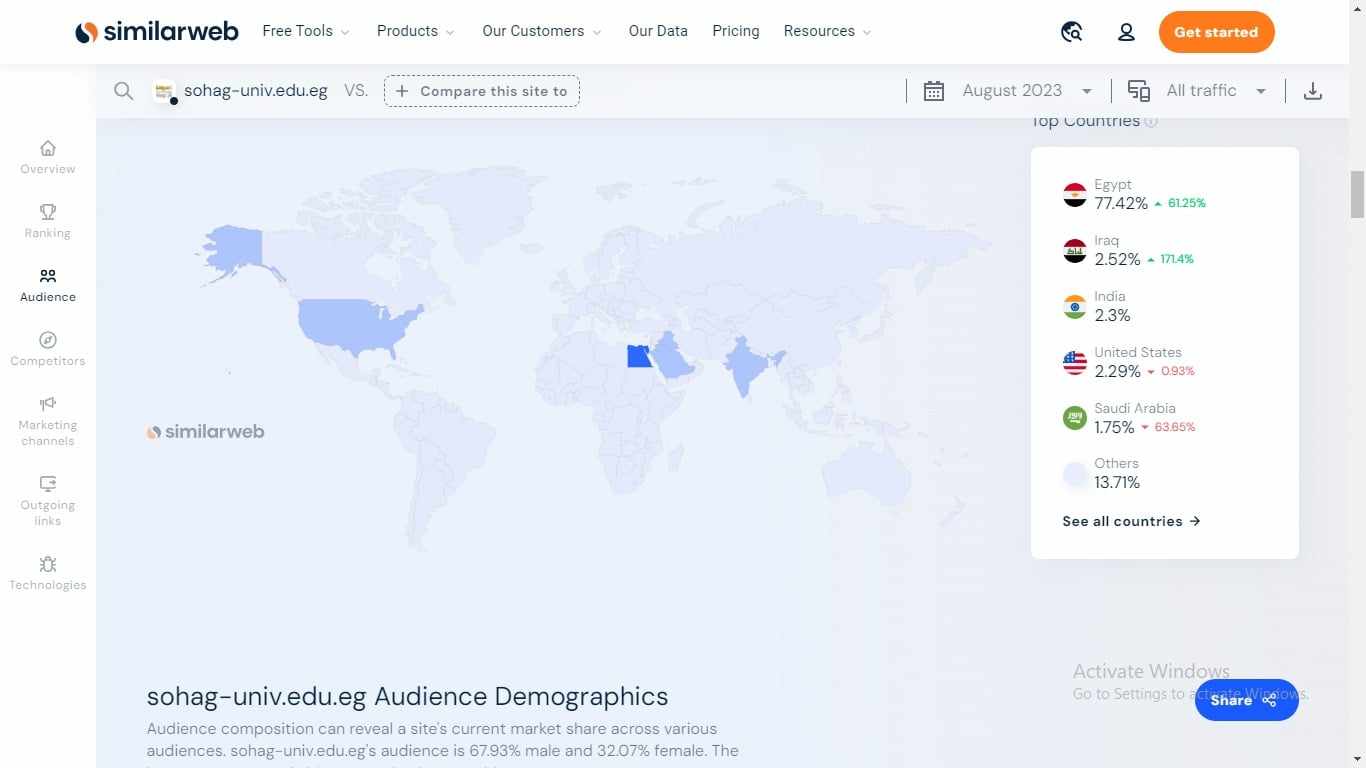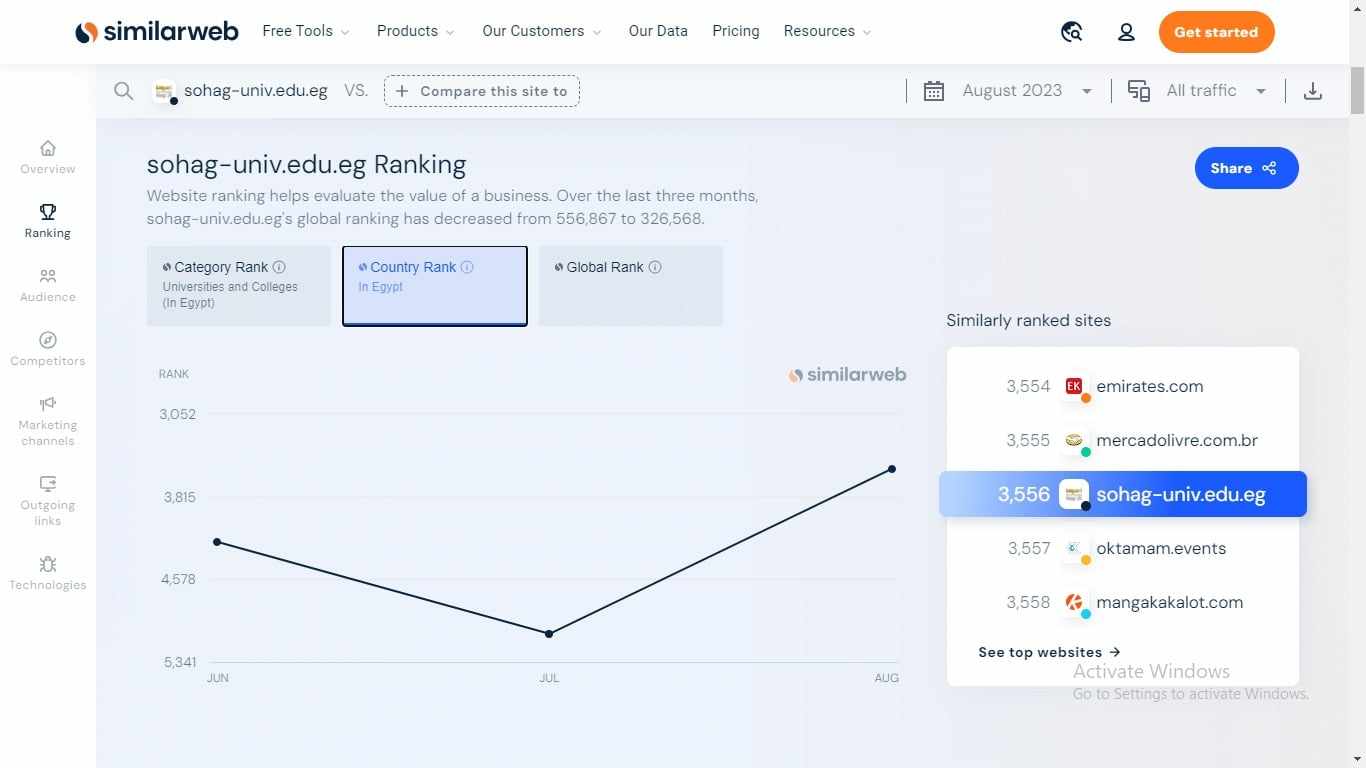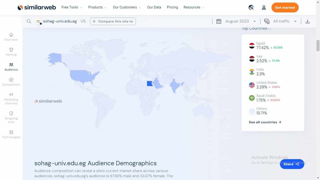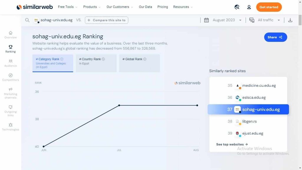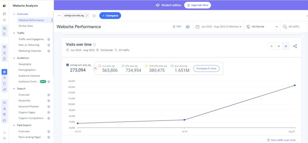 طبقًا لبيانات  موقع  Similar web   للتحليل الرقمي، حقق موقع جامعة سوهاج خلال الثلاثة أشهر الماضية  أعلى نسبة مشاهدة، حيث سجلت الإحصائيات دخول ما يقارب الـ 273 الف زائر إلى موقع الجامعة في الفترة من   1 يونيو حتي 31  أغسطس  2023.